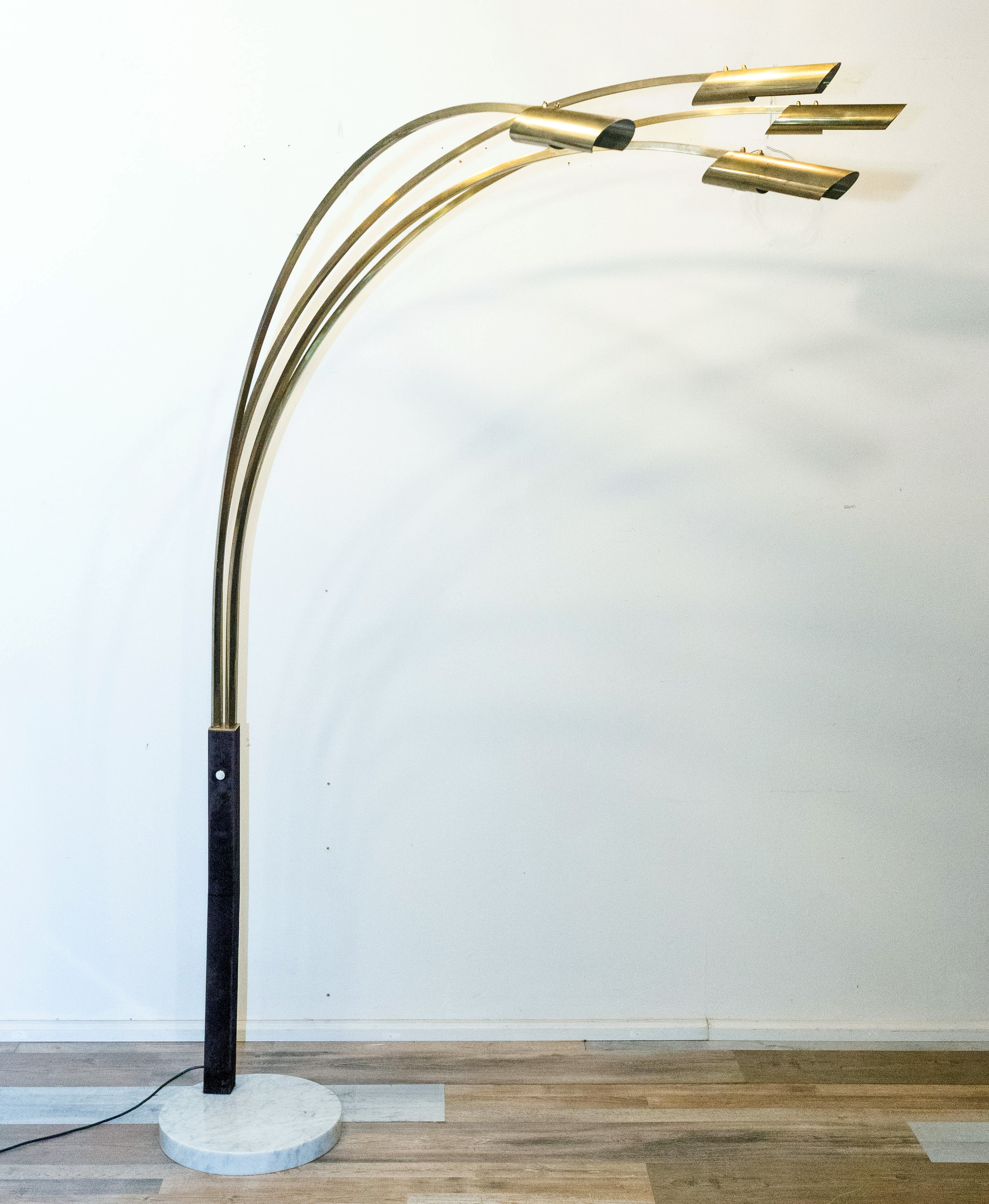 Lampada ad arco vintage in ottone, stile Reggiani, con 4 bracci e base in marmo. Presenta i naturali segni del tempo.