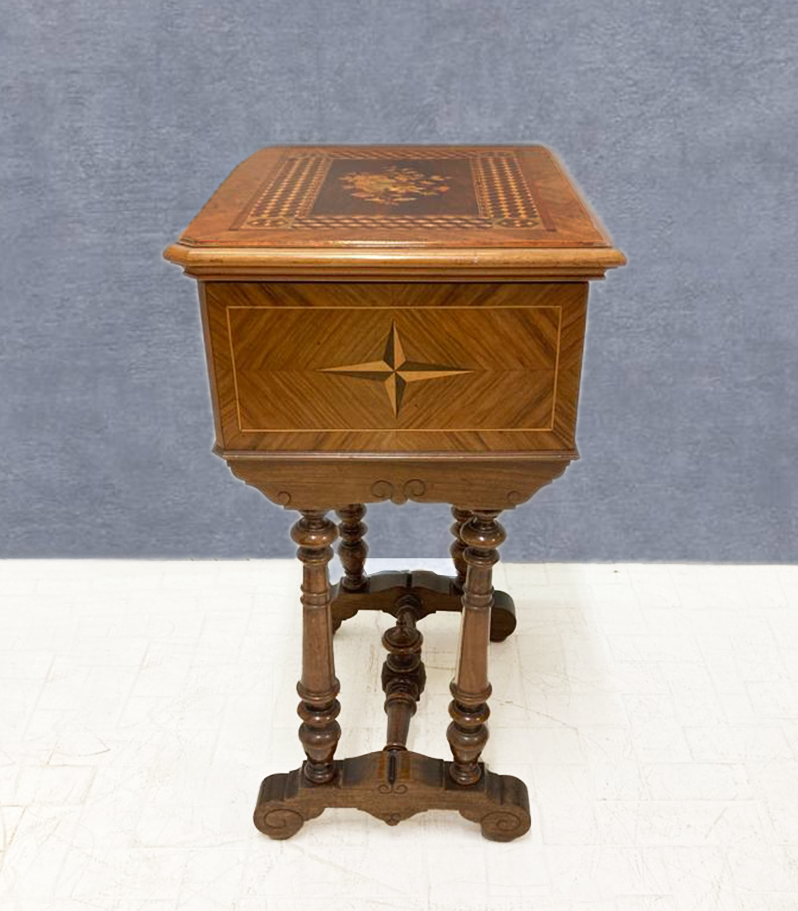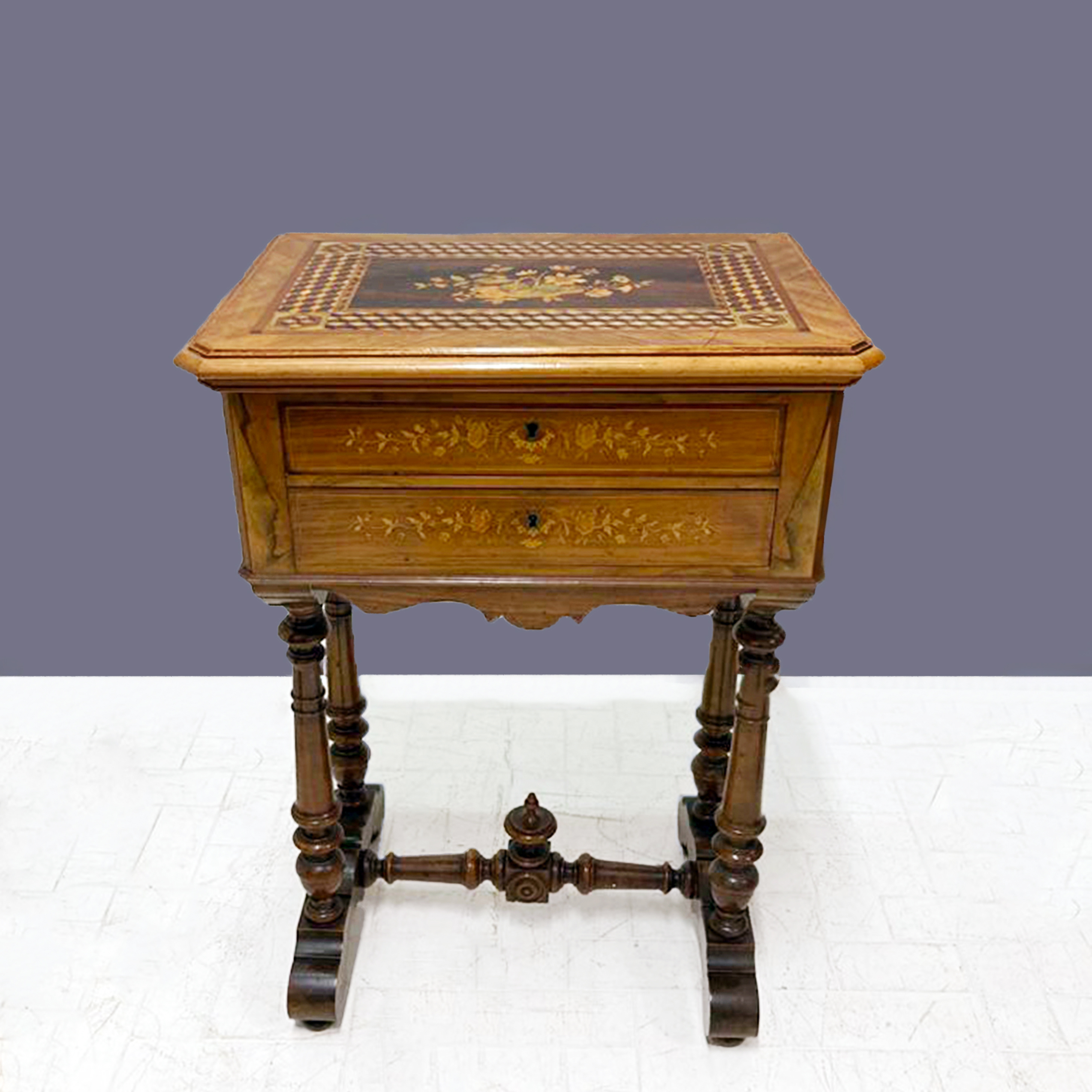 Tavolino da lavoro e da appoggio in noce, con ricco intarsio, periodo fine '800