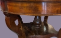 La struttura è sostenuta da quattro gambe mosse, elegantemente sagomate, riunite da un caratteristico ripiano inferiore a cestello, elemento distintivo di questa tipologia. Il sostegno centrale tornito funge da fulcro visivo e strutturale, donando equilibrio e solidità al mobile.