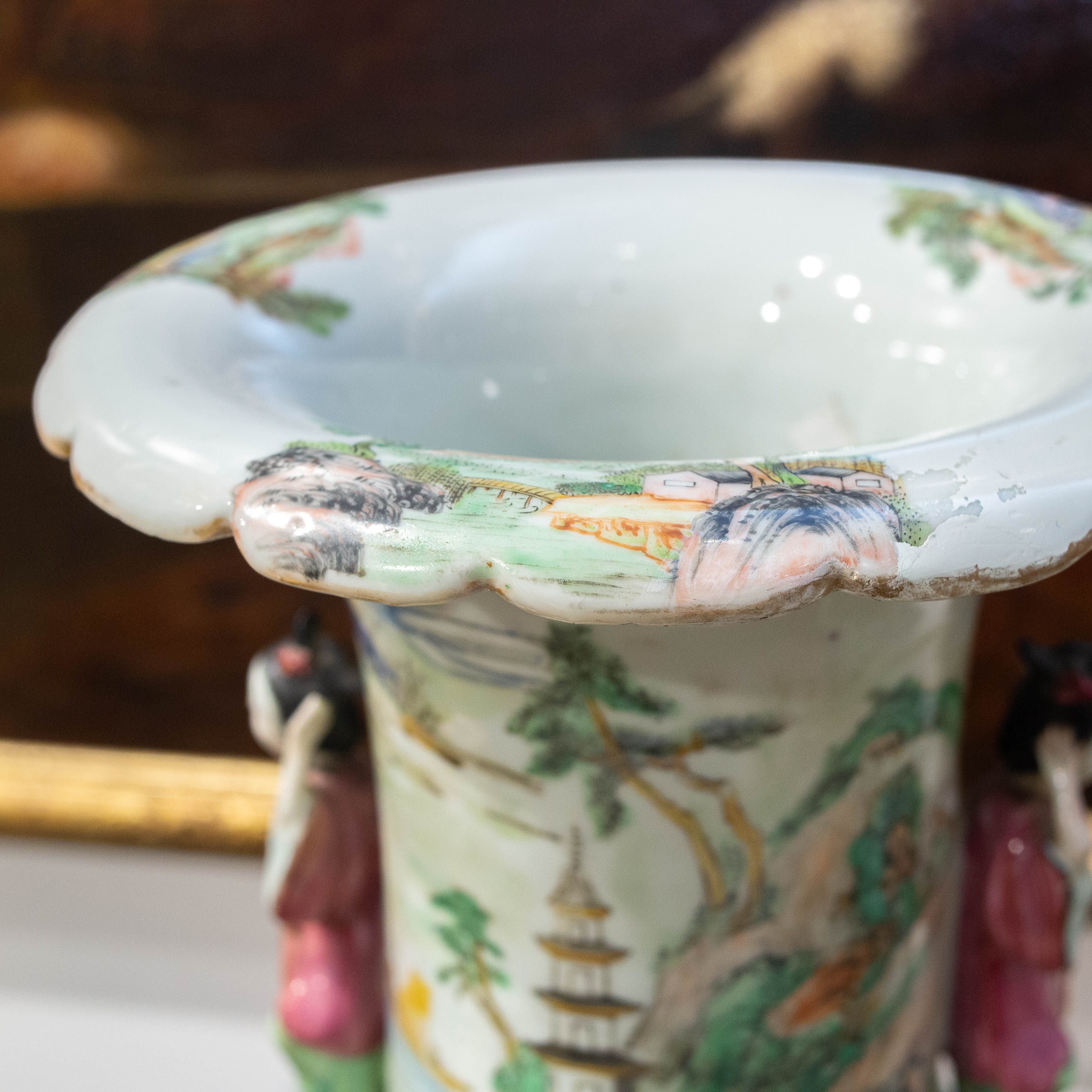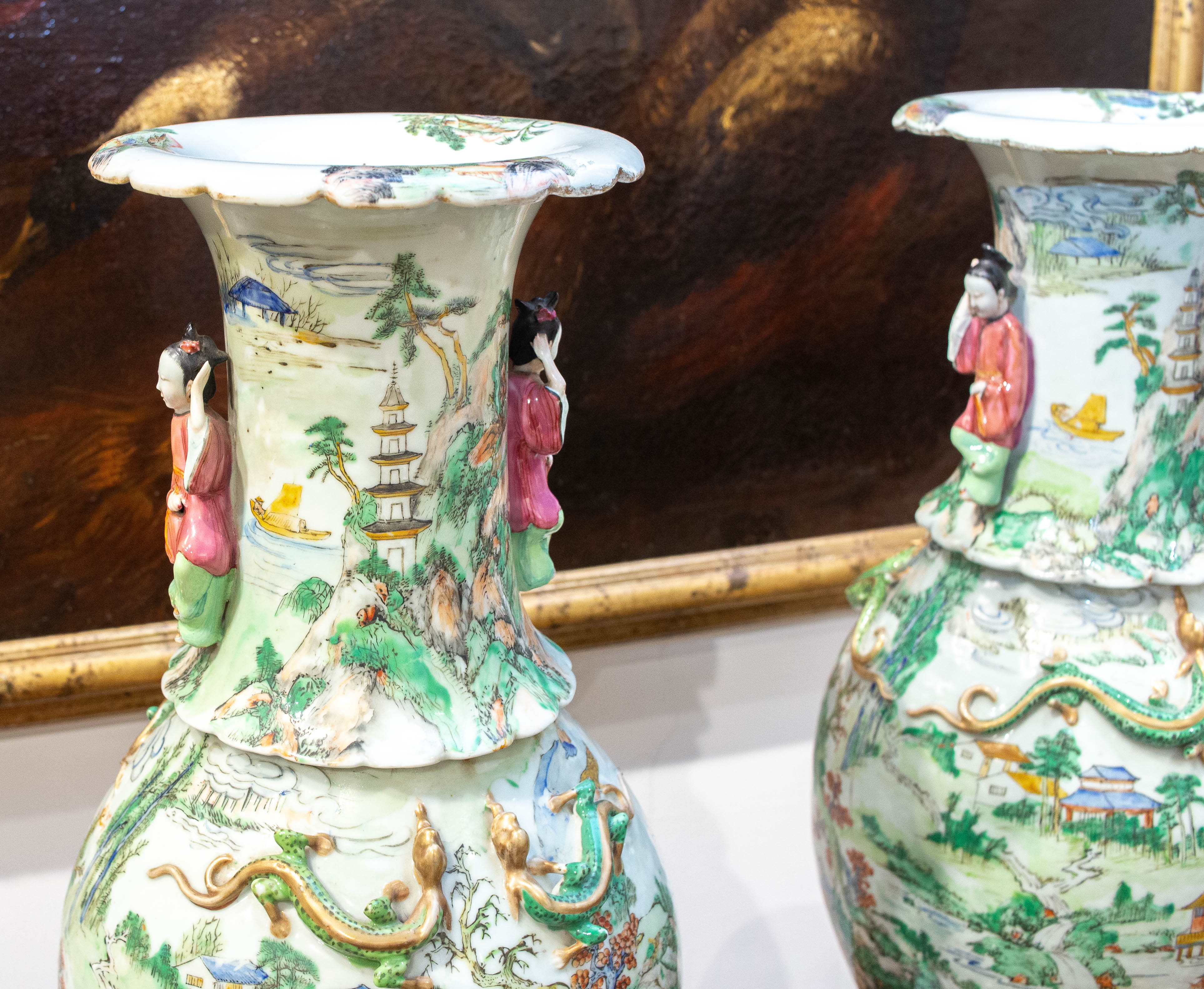 Belli e rari vasi in porcellana con raffigurazioni di paesaggio, anse a foggia di fanciulle e draghetti a rilievo, Cina, Dinastia Qing, epoca Daoguang (1821-1850).