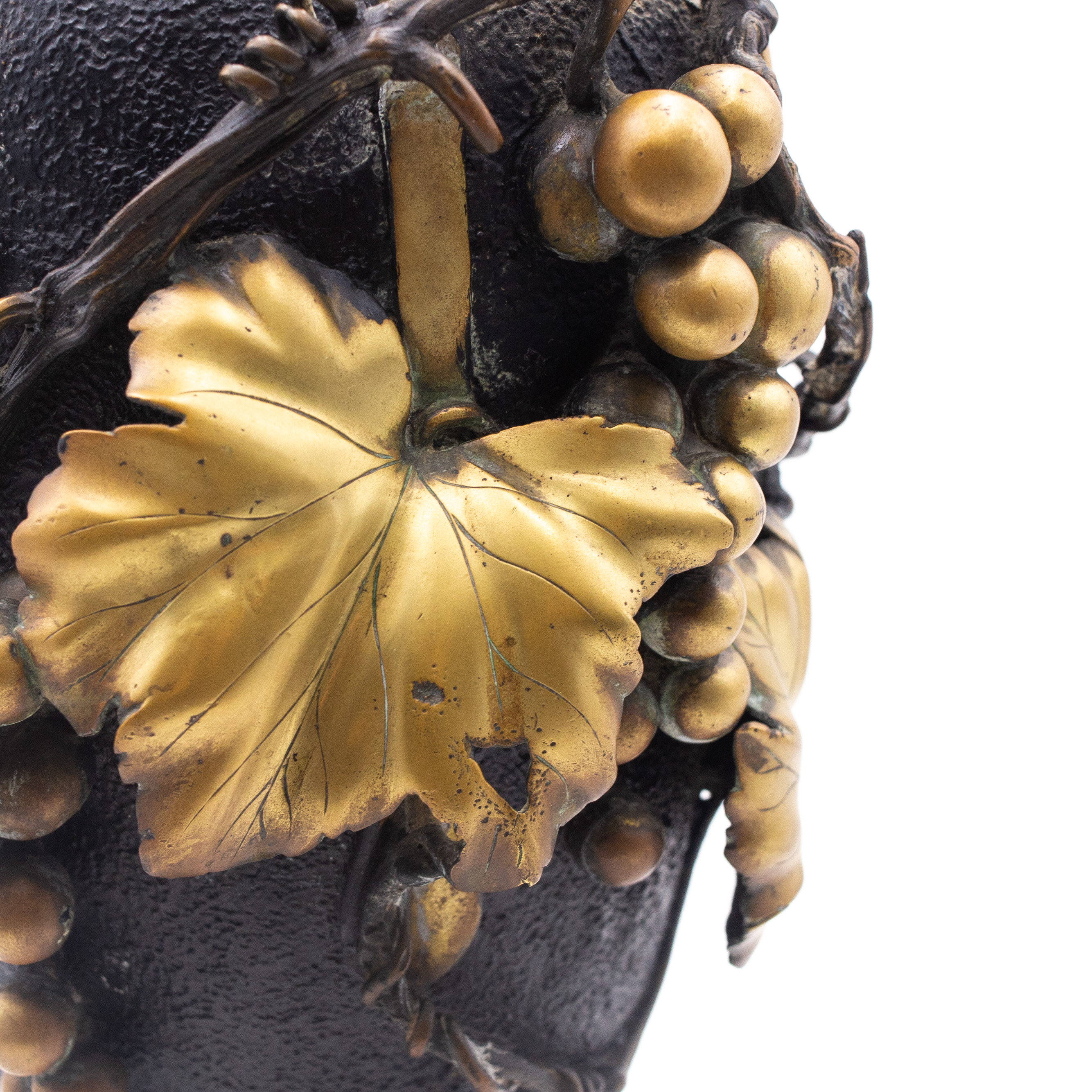 Vaso Giapponese in bronzo con uva e vite, con decori patinati ottone, Fine '800