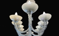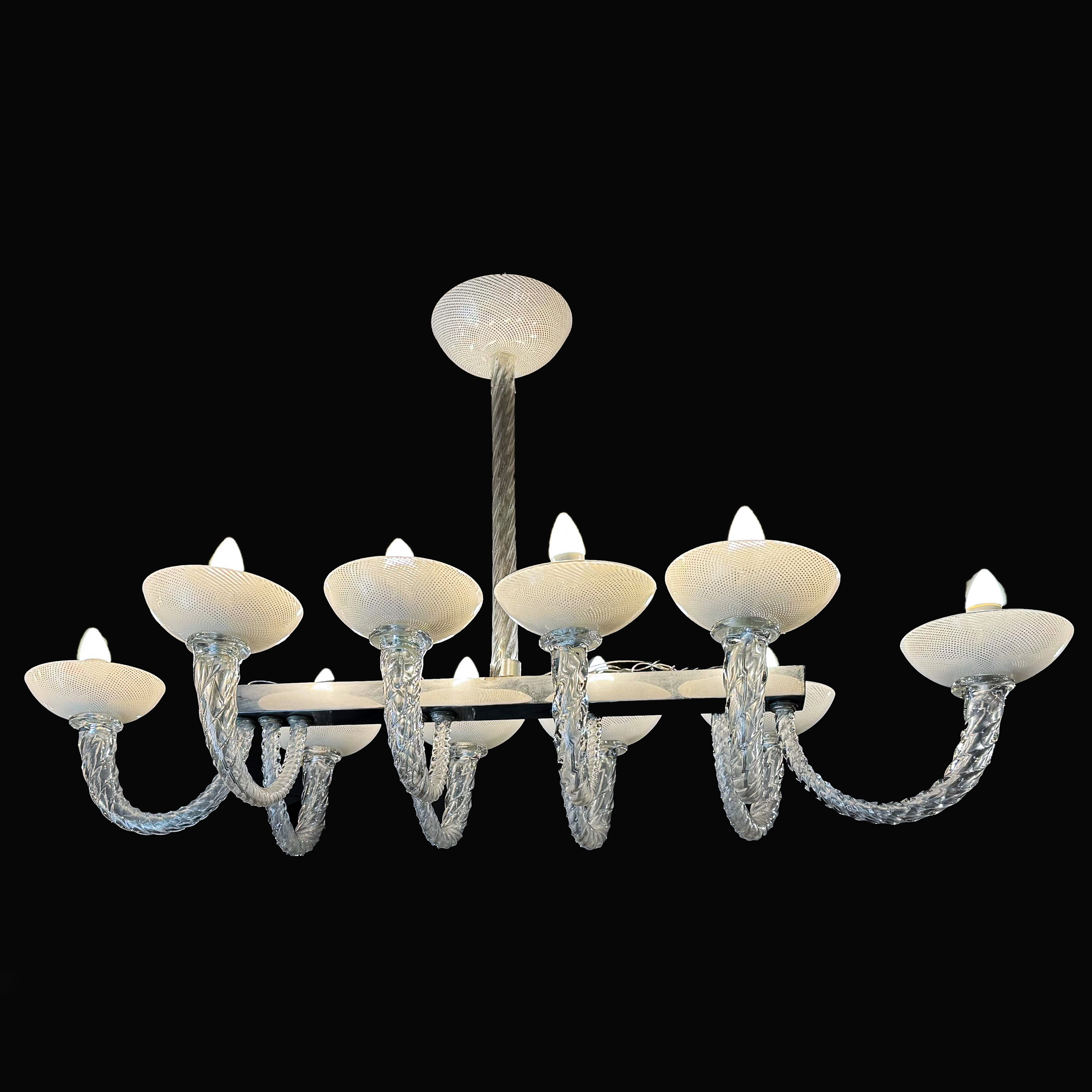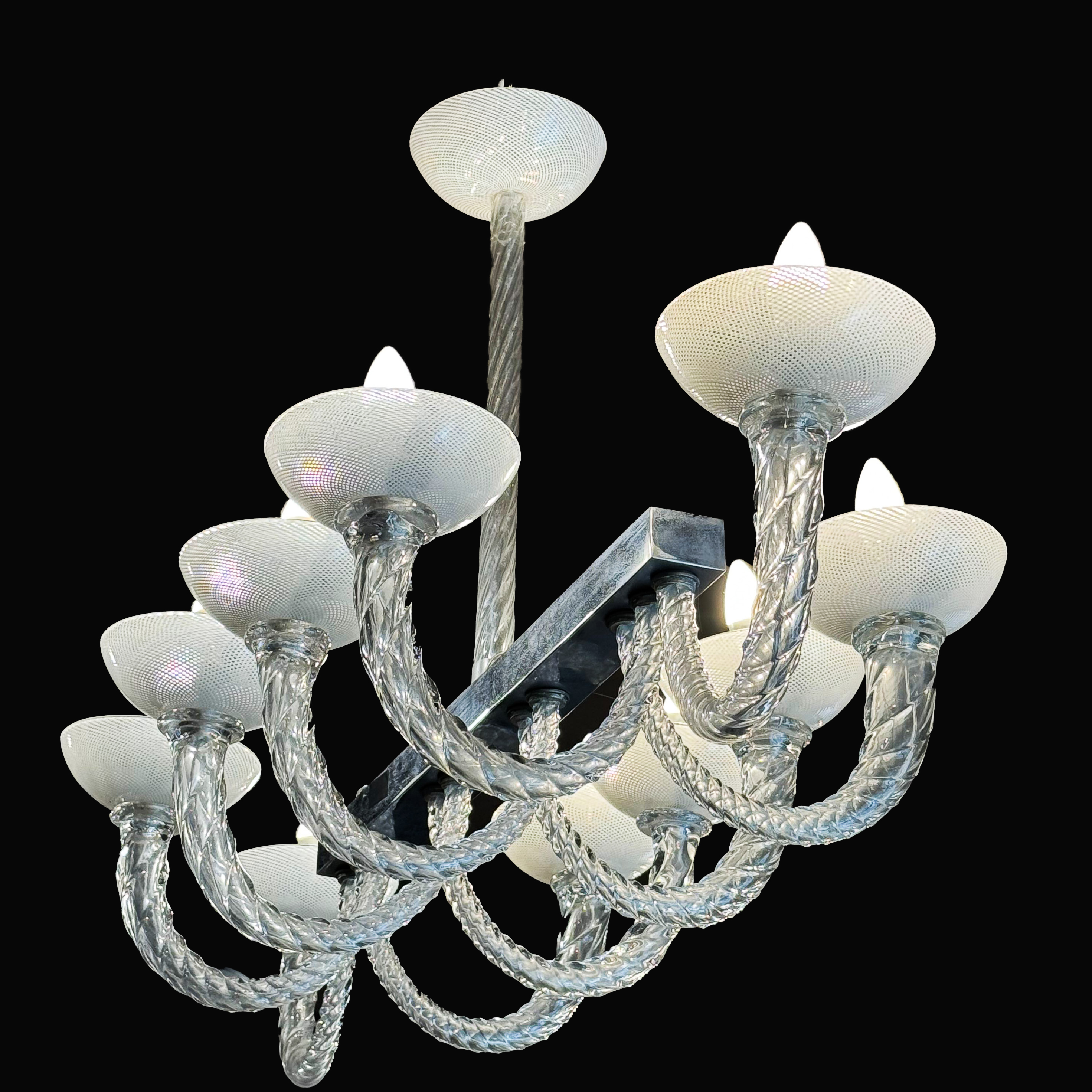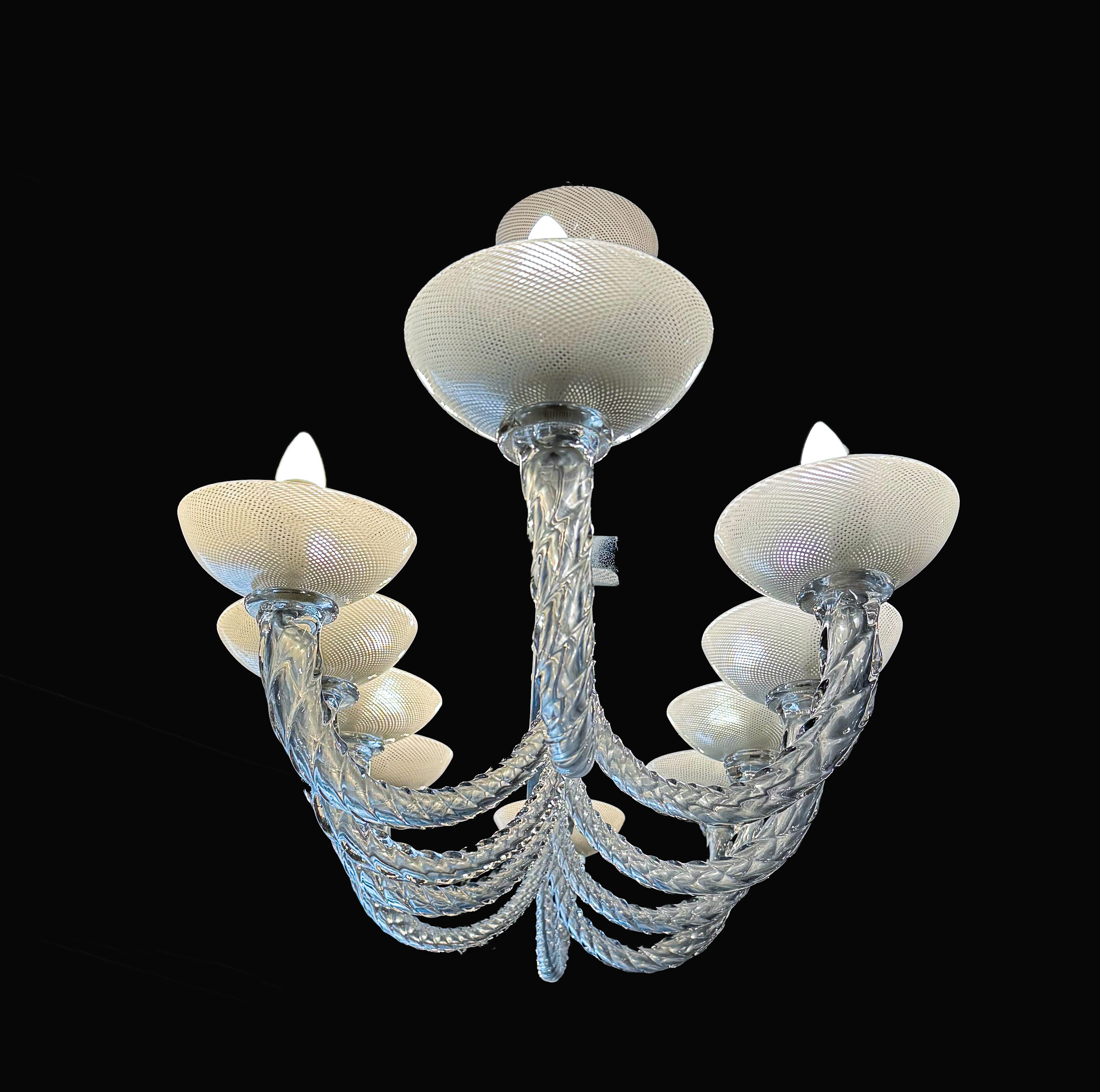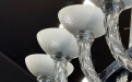Bracci in vetro lavorato a mano: ogni braccio è modellato in un vetro trasparente leggermente mosso, con una lavorazione a ritorti tipica della tradizione muranese, che crea riflessi e giochi di luce eleganti.