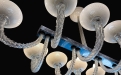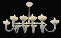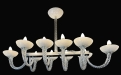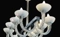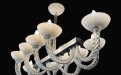 Il lampadario presenta una struttura imponente ma armoniosa, sviluppata su più bracci sinuosi che si aprono a corona.