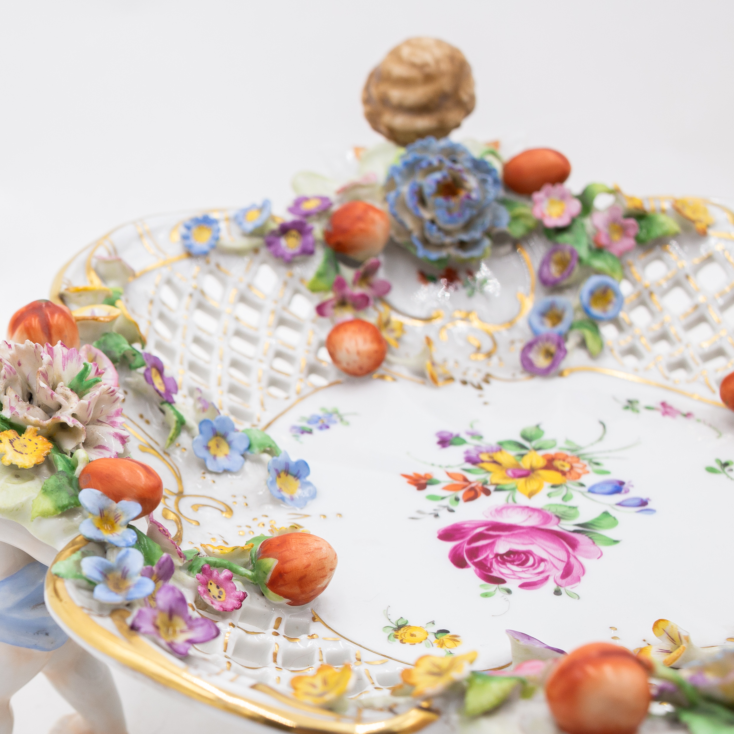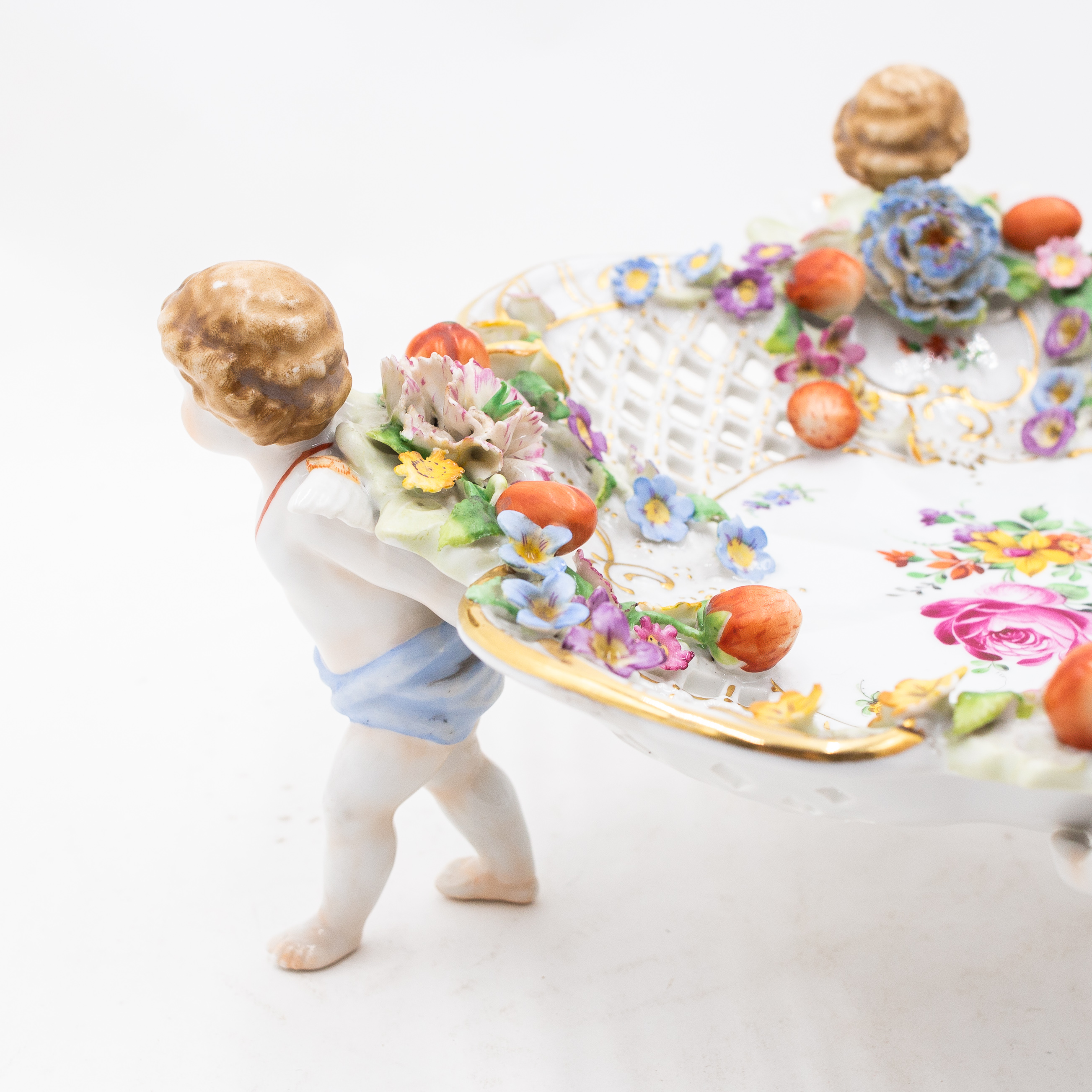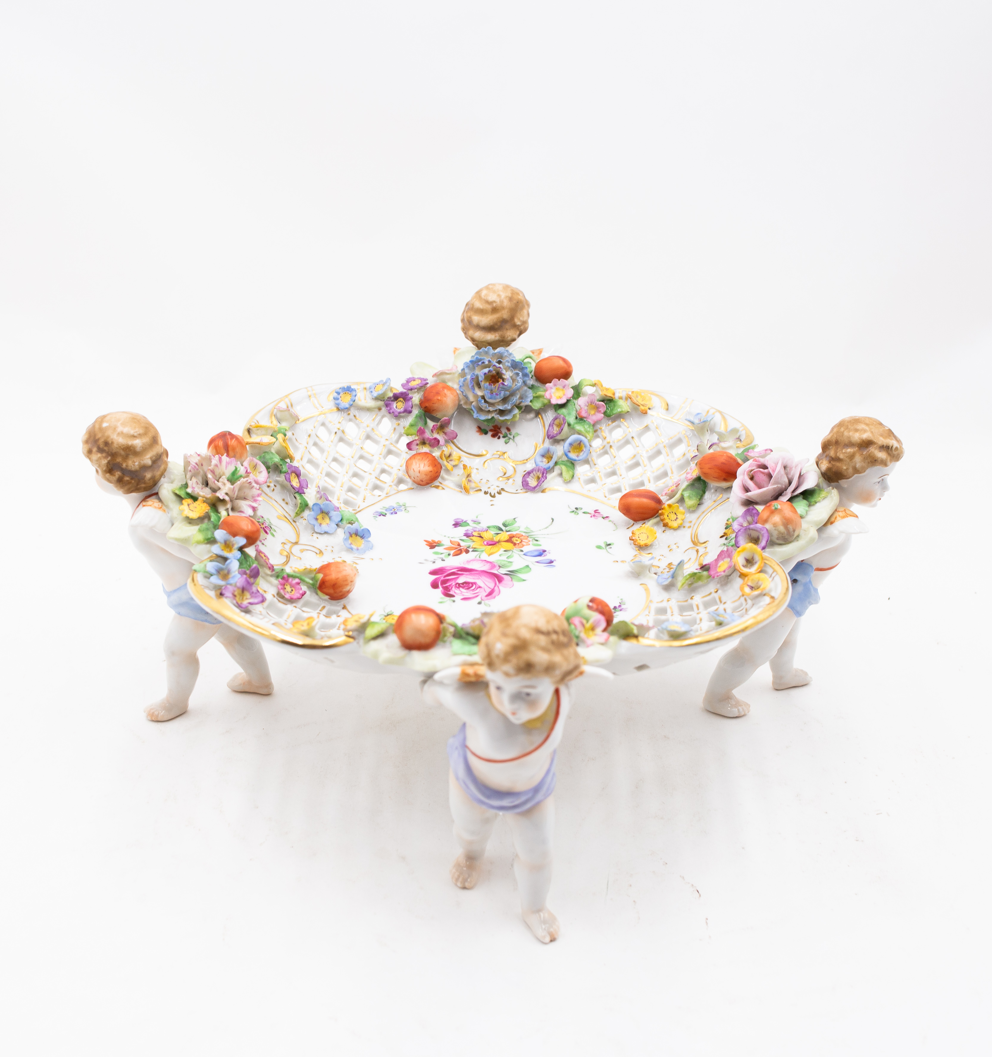 Elegante centrotavola figurativo in porcellana, costituito da un cesto traforato riccamente decorato con fiori estivi policromi, applicazioni plastiche di ghirlande floreali e frutta e raffinati dettagli in oro. Il cesto è sostenuto da quattro cherubini alati, finemente modellati, disposti simmetricamente e colti nell’atto di sorreggere la struttura con grazia e dinamismo.